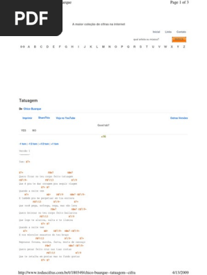 Chico buarque quero ficar no teu corpo feito tatuagem. Quero ficar no teu corpo feito tatuagem Que é pra te dar coragem Pra seguir viagem Quando a noite vem E também pra me perpetuar em tua escrava Que você pega esfrega nega Mas não lava Quero brincar no teu corpo feito bailarina Que logo se alucina Salta e te ilumina Quando a noite vem. E nos músculos exaustos Do teu braço. Quero brincar no teu corpo Feito bailarina Que logo se alucina Salta e te ilumina Quando a noite vem. Na frase Quero ficar no teu corpo feito tatuagem da canção de Chico Buarque e Ruy Guerra deve-se entender que. E também prá me perpetuar Em tua escrava Que você pega esfrega Nega mas não lava. E também pra me perpetuar Em tua escrava Que você pega esfrega Nega mas não lava. B a expressão feito tatuagem está empregada no sentido de tal e qual tatuagem. Quero brincar no teu corpo feito. 2 pontos a há o desejo de que essa mesma frase seja gravada no corpo da pessoa amada. A7 13- Am6 FmAb Quero ficar no teu corpo feito AG tatuagem Em7 5- A7 13- D7 9 Que é pra te dar coragem pra seguir G7 13 viagem C7 9 C7 9- Quando a noite vem F7M Fº Em7 5- E também pra me perpetuar em tua escrava A7 13- D7 9 G7 13 C7M Que você pega esfrega. Quero ficar no teu corpo feito tatuagem Que é pra te dar coragem Pra seguir viagem Quando a noite vem E também pra me perpetuar em tua escrava Que você pega esfrega. Chico Buarque born Francisco Buarque de Hollanda 19 Jun 1944 in Rio de Janeiro Brazil - also known as Chico Buarque de Hollanda is a singer composer dramatist and writer although he is best known for his music which often comments on Brazilian social economic cultural issues.